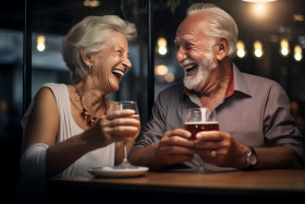love smile couple old restaurant drink glass laughing happy together senior date romance marriage relationship happiness life enjoyment food meal fun laughter conversation connection intimacy bond lovebirds love story soulmates partners in crime best friends lovers companions life partners forever and always happily ever afterImagine Buddy
