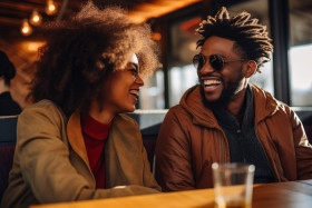 african american couple dating restaurant table chairs dinner drinks conversation love happiness romance togetherness date night romantic dinner fine dining candlelight dinner special occasion celebration anniversary engagement proposal love story relationship couple goals black love interracial couple young love happy couple love birds soulmate partner in crime ride or die best friend loverImagine Buddy