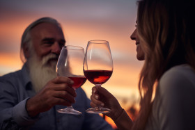 A picture of a couple clinking their glasses with drinks at sunset, with a colorful sky in the background, festivals and occasions anniversary image