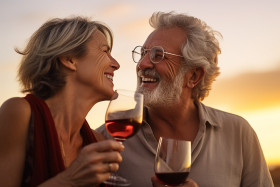 A picture of an older couple in love having a drink on the beach at sundown, festivals and occasions anniversary image