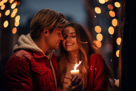 young romantic couple fun outdoors winter christmas bengal lights enjoying spending time together new year's eve lovers hugging love happy joyful festive holiday celebration winter wonderland snow ice cold winter clothes winter activities winter sports winter vacation winter holidays winter fun winter love winter romance winter couple winter date winter night winter magicImagine Buddy