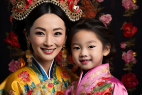 asian woman smile daughter traditional chinese dress new year happy celebration family culture love togetherness joy happiness luck fortune prosperity red gold festive bright colorful vibrant beautiful stunning adorable precious mother daughter love bond connection heritage tradition celebration blessing new beginning fresh start hope optimism futureImagine Buddy