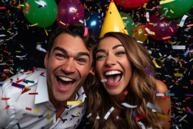 A picture of a happy couple celebrating new years with balloons and confetti, happy new year image