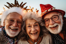 A close up photo of older people celebrating new years eve together at the beach, happy new year image hd