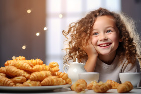 A picture of a pretty girl eating croissants in a well lit room, food and drink at home image