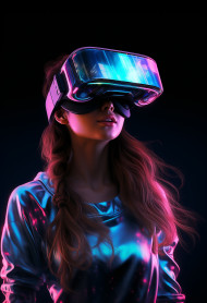 A young woman wearing a virtual reality headset with neon lights, futuristic image