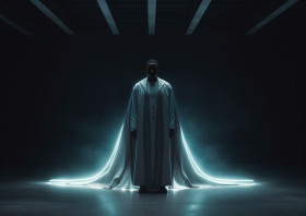 A dark-cloaked man stands in a dimly lit room, futuristic image