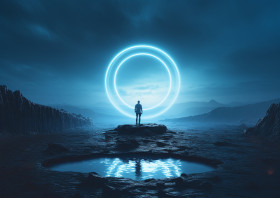 A picture of a man standing on the moon, with a bright ring of light behind him, futuristic image