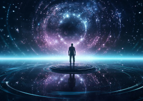 A picture of a man in the shape of a circle standing in a ring above a night sky full of stars, futuristic image