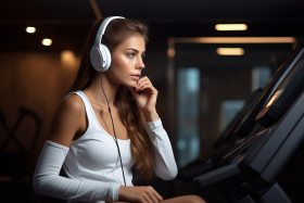 A photo of a young, thin, athletic caucasian woman in white sportswear wearing earphones and listening to music, indoor sports and leisure activities images