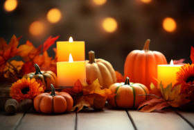 thanksgiving table wooden pumpkin corncob candle autumn leaves garland background photo happy decoration harvest fall holiday feast celebration food family friends dinner grateful blessed thankfulness joy love togetherness memories traditions home season nature warmth cozy inviting rustic farmhouse cozy home festiveImagine Buddy