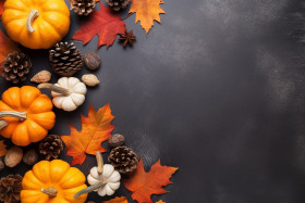 A photo of a fall border banner with pine cones pumpkins dried leaves and a pumpkin latte on a dark gray stone table