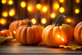 A photo of small pumpkins and leaves on a rough wooden table with lights and a blurry background
