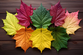 A picture of many colored maple leaves on a wood table