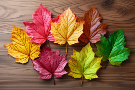 autumn leaves maple fall foliage nature colorful autumnal seasonal vibrant colorful leaves maple leaves autumn foliage fallen leaves autumn colors wooden background red leaves orange leaves yellow leaves brown leaves green leaves leaf autumn scene thanksgivingImagine Buddy