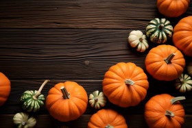 A photo of a thanksgiving greeting with pumpkins and leaves on a dark wooden table