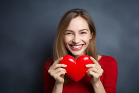 Picture of a young woman smiling and holding a red heart she is saying thank you for love
