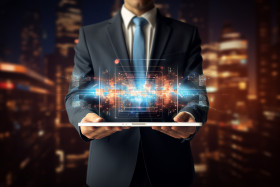 Digital marketing concept in businessmans hands holding a tablet computer, seo stock images for marketing campaigns