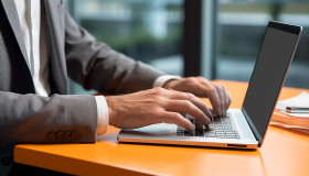 Typing on laptop using wireless technology indoors, seo stock images for marketing campaigns