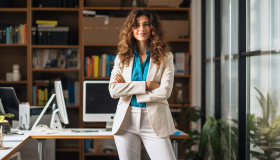 A photo of a successful young businesswoman standing in the office presenting, free ai prompts for hr