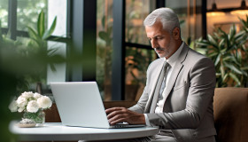 A photo of a senior businessman working on a laptop in room, free ai prompts for hr