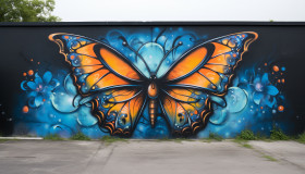 A graffiti wall with an orange and bright blue butterfly, free ai prompts and images floral photo backdrops