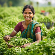 indian woman farm harvest worker smiling friendly blurred background agriculture rural countryside crops food work labor manual job employment female adult young healthy happy positiveImagine Buddy