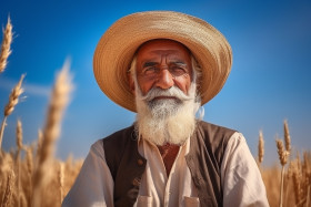 indian farmer senior wheat field hat agriculture farming rural man countryside crop golden harvest happy smile portrait work outdoor nature sunshine summer food grain land labor village tradition culture healthy strong experienced proud satisfied abundance prosperity livelihood heritage essentialImagine Buddy