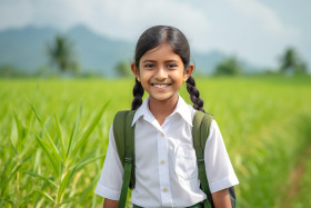 Happy school girl in uniform smiles at the camera while standing in a paddy field